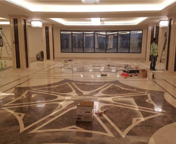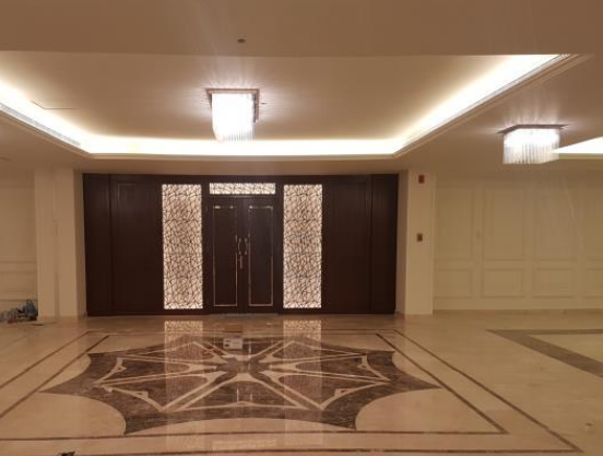 تتميز الصالة بتصميم عصري يجمع بين الفخامة والأناقة، مع استخدام مواد عالية الجودة في الأرضيات والجدران.حيث تم استخدام بلاط رخام فخم بتصميم هندسي رائع يضيف لمسة جمالية للمكان.، وتم تركيب إضاءة متميزة تعزز من جمال الصالة وتخلق أجواء مريحة.